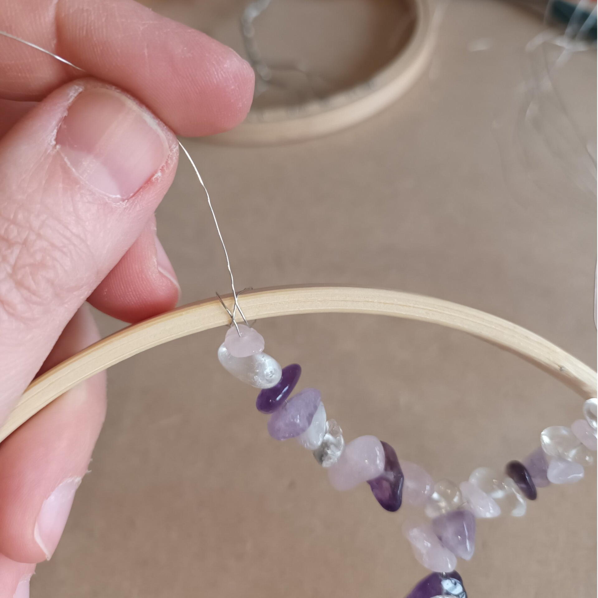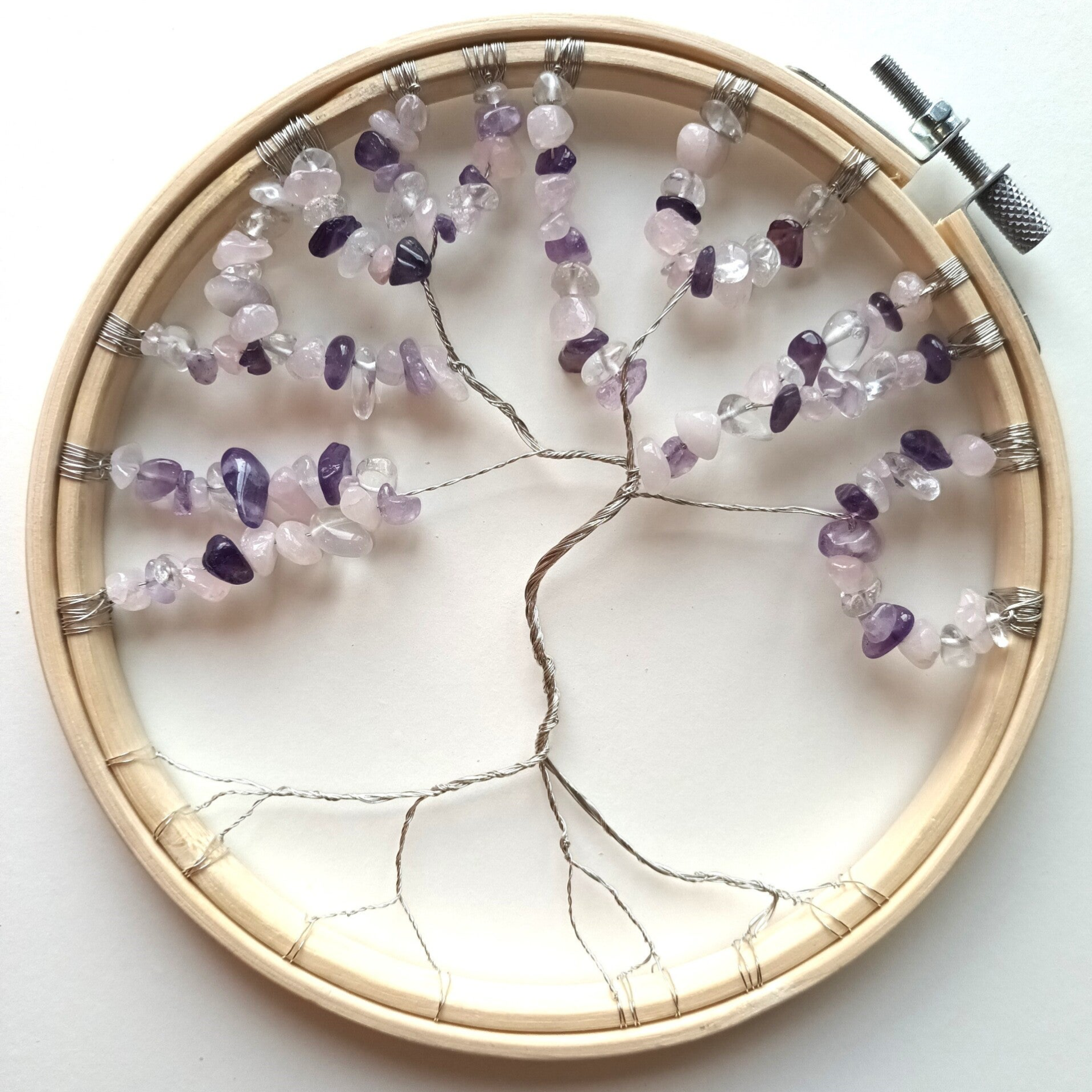 In deze tutorial maken we een levensboom. We maken de stam en takken uit ijzerdraad gewikkeld rond een borduurring. Daarna rijgen we de edelstenen als blaadjes aan de takken.