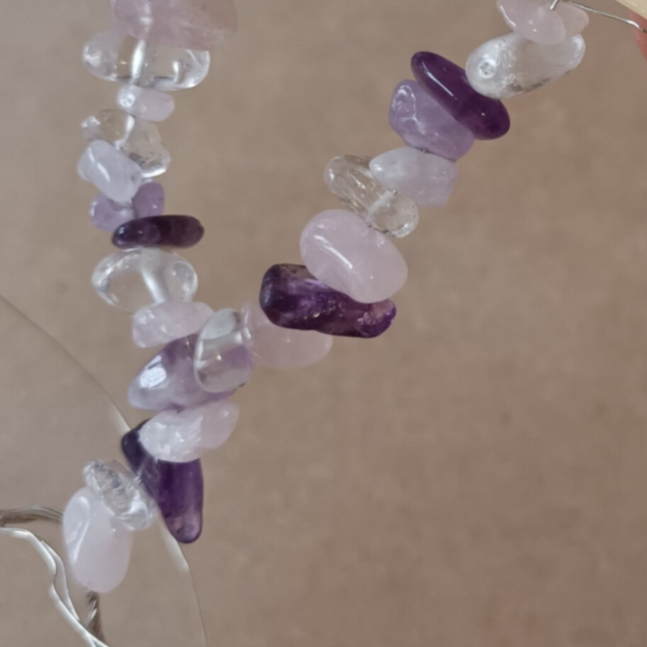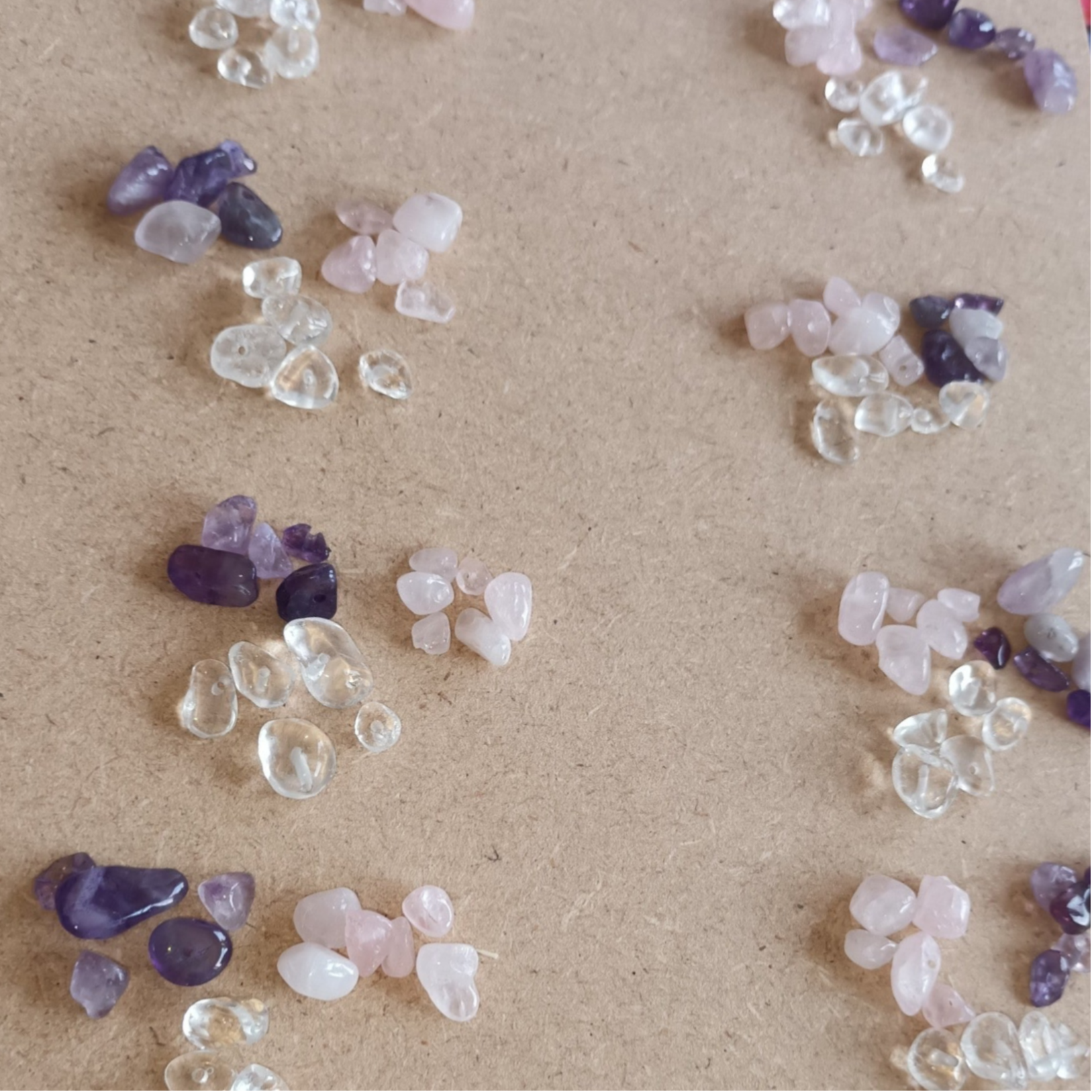 Kies zelf jouw favoriete edelstenen. Ik koos voor de gouden driehoek: amethist, rozenkwarts en bergkristal. Koop edelstenen met een voorgeboord gaatje. De meeste winkels verkopen ze gerijgd aan een streng. Ik koos voor splitkralen, deze hebben een onregelmatige en daardoor meer natuurlijke vorm.